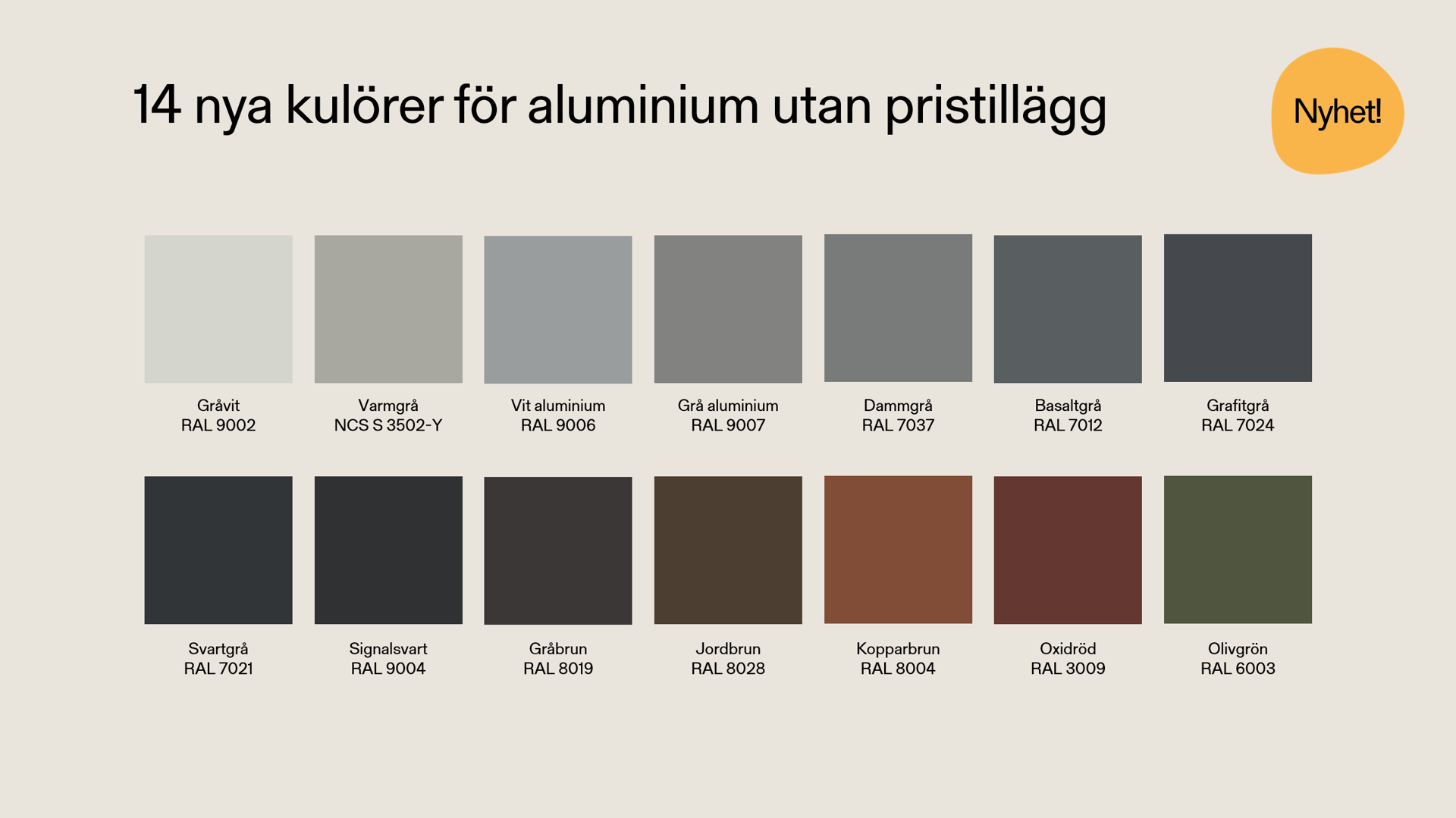 14 nya aluminiumkulörer utan pristillägg för fönster och altandörrar